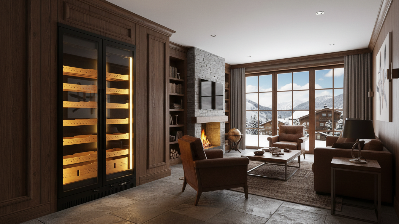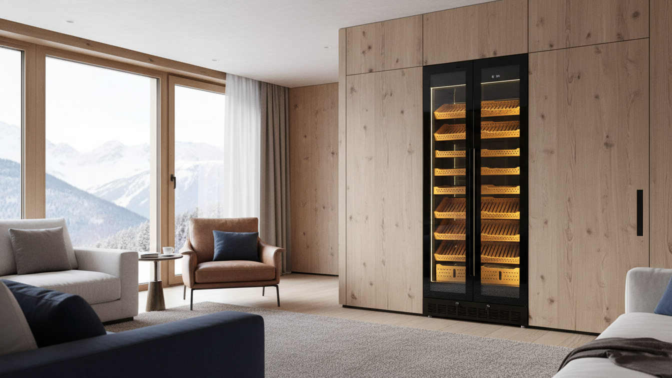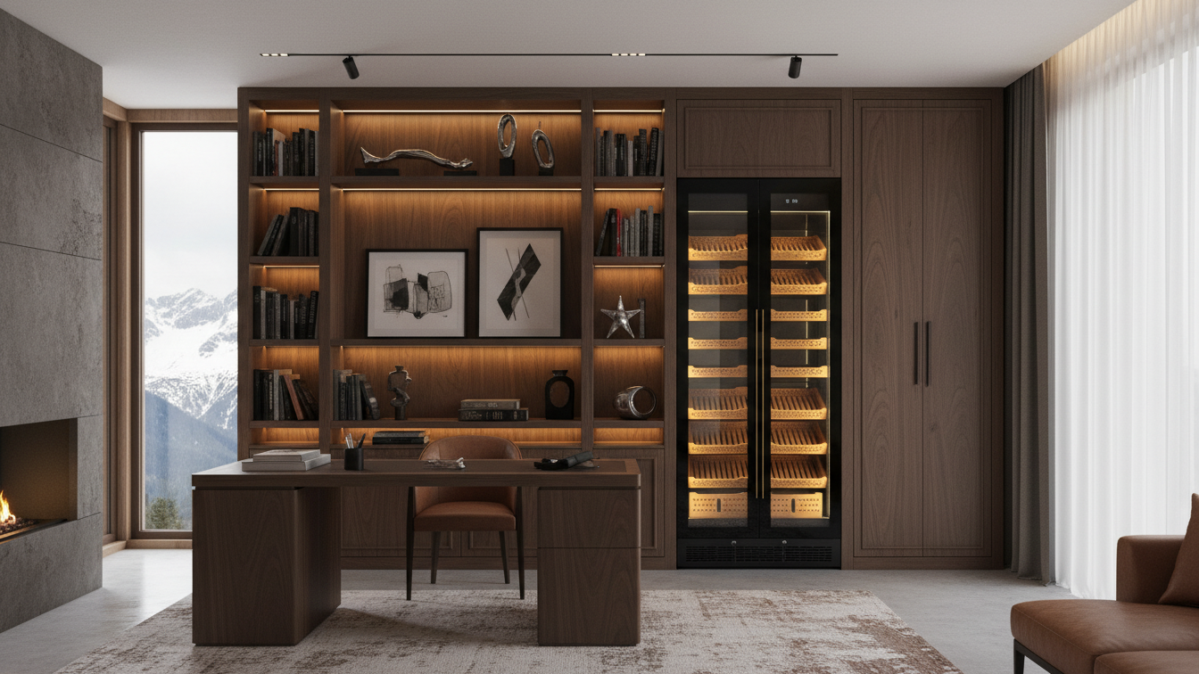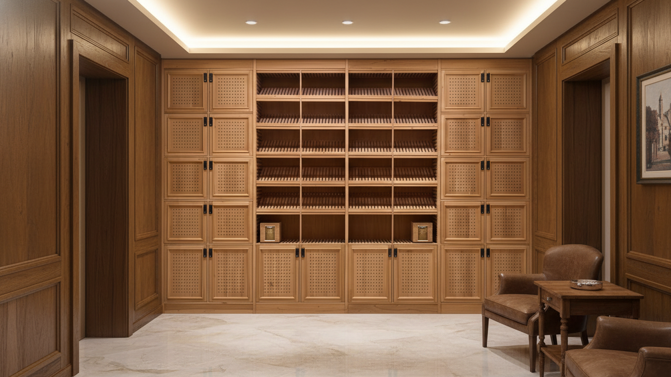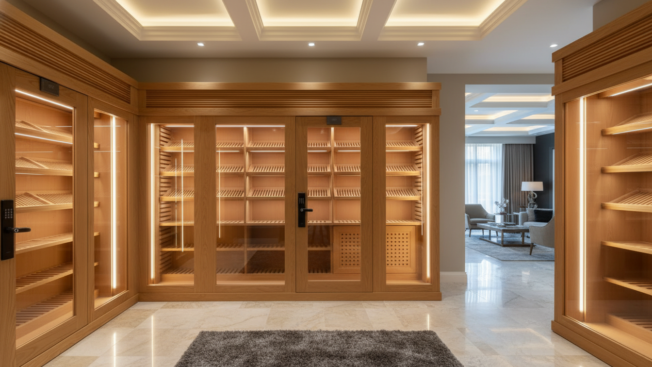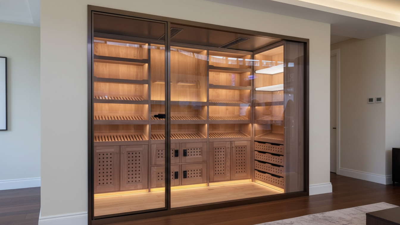 A walk-in cigar room is a dedicated humidor space designed for higher capacity and a true lounge experience. It offers stable long-term aging and a premium “club” atmosphere.